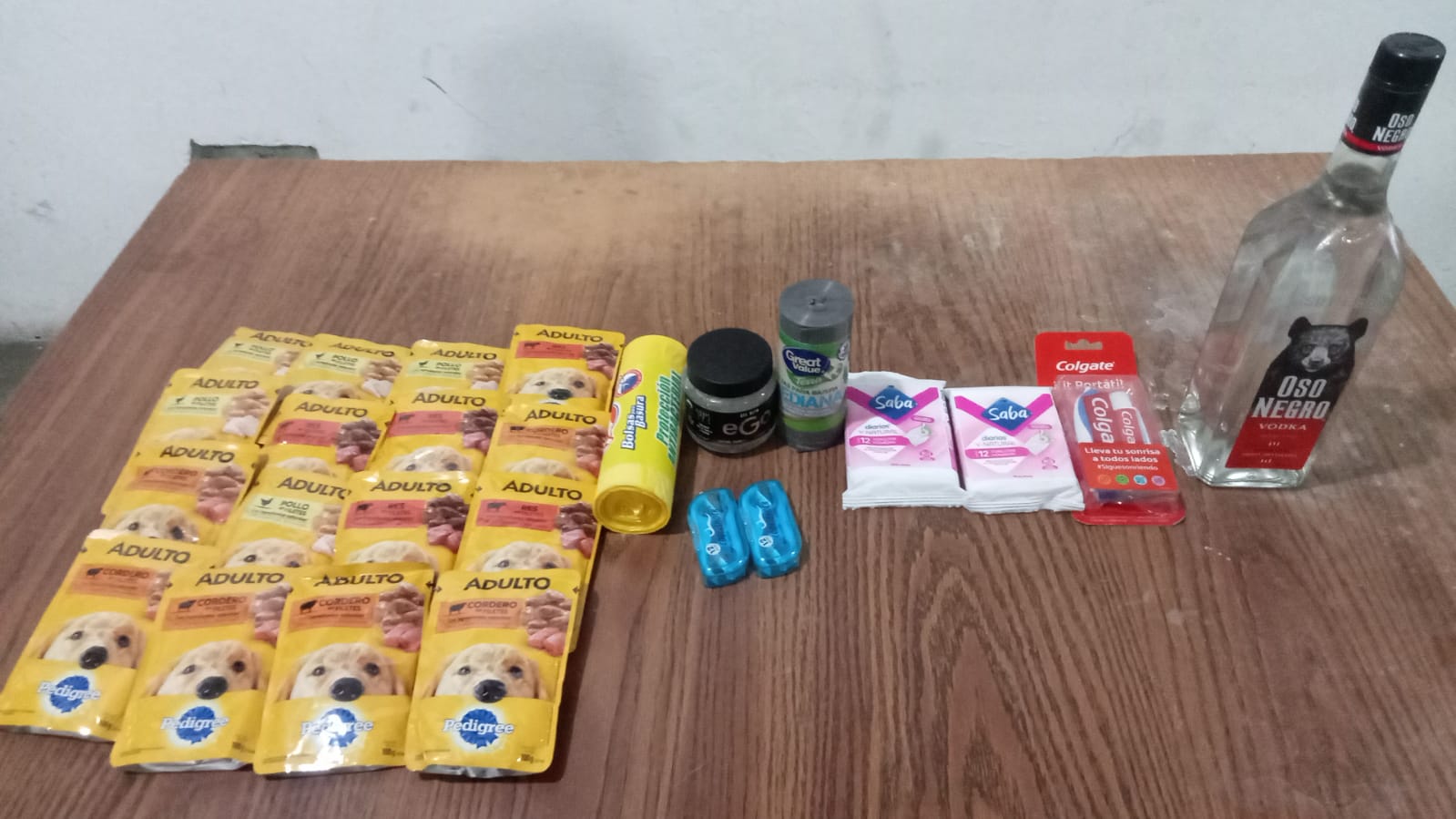 Sin embargo, también agregó un peine para mascota, un par de paquetes individuales de toallas femeninas, bolsas para basura, gel para el cabello, pasta dental y hasta una botella de Vodka de la marca Oso Negro.