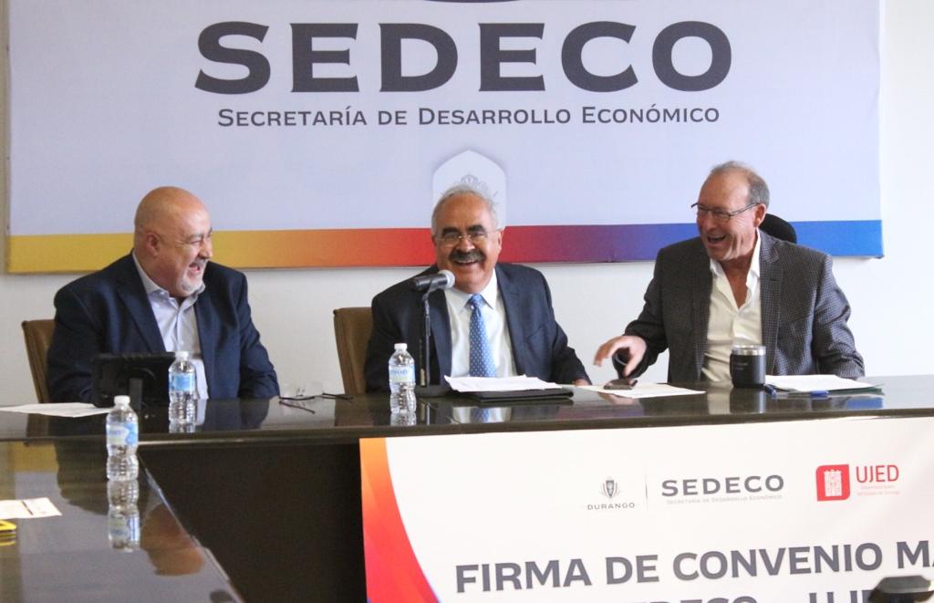 El rector de la UJED, por su parte, mencionó que la Universidad firma numerosos convenios, pero este en particular ha sido exitoso y beneficioso para los empresarios de Durango. A través del Centro de Negocios de la máxima casa de estudios se ha brindado asesoría a 52 empresas de Durango, se han etiquetado más de 120 productos regionales y se han realizado más de 25 diseños de etiquetas y asesorías a empresas de la entidad.