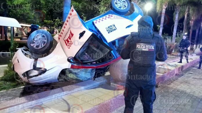 Un taxista fue víctima de un fuerte accidente de tránsito este sábado por la madrugada, en el cual su coche acabó con las cuatro ruedas hacia arriba entre los elementos de ornato del jardín Nazas; el sujeto se fue de la escena antes de la llegada de las autoridades.
