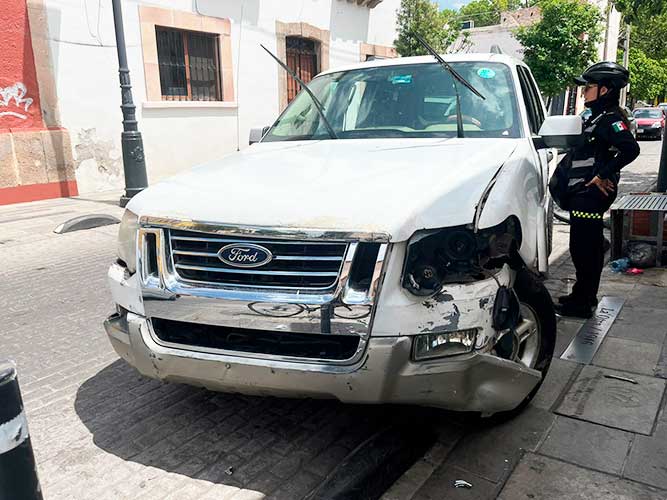 Daños en su camioneta y a la infraestructura de la remodelada calle Hidalgo, fue el resultado de un accidente vial ocurrido el jueves por la tarde, hecho en el que no hubo personas lesionadas.