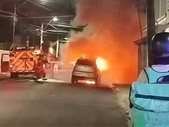 Fue cerca de las 23:00 horas cuando se solicitó apoyo del Cuerpo de Bomberos a un costado de la Secretaría de Salud, ante la intensidad de un siniestro que inició en el área de motor del coche.
