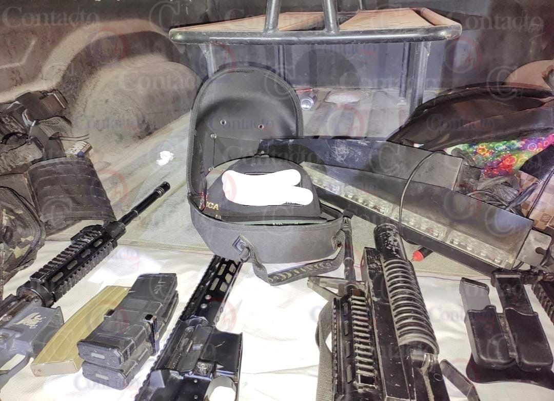 Al hacerlo, descubrieron que no solo tenía consigo la pistola calibre 9 mm ya mencionada, sino también cuatro armas largas más, 655 cartuchos de diversos calibres, un aditamento lanzagranadas, tres chalecos tácticos y un radio de comunicación.