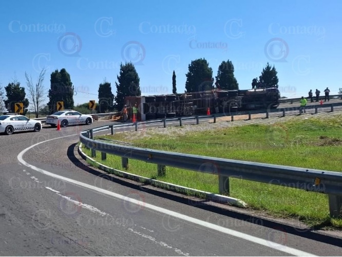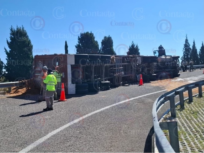 Una curva mal tomada derivó en la volcadura de un tractocamión cargado con aserrín, hecho ocurrido este sábado por la mañana en el Distribuidor Vial del Aeropuerto Internacional Guadalupe Victoria.