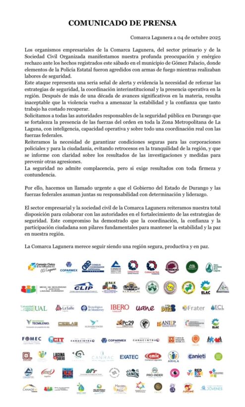 Gómez Palacio, Dgo.— Los organismos empresariales de la Comarca Lagunera, junto con representantes del sector primario y de la sociedad civil organizada, emitieron un comunicado en el que expresan su profunda preocupación y enérgico rechazo ante los hechos violentos ocurridos este sábado en Gómez Palacio, donde un grupo armado atacó a elementos de la Policía Estatal que realizaban labores de seguridad y arrojaron un artefacto explosivo contra un retén.