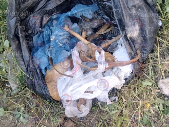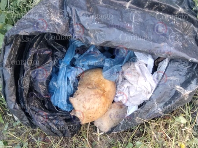 Dentro de la bolsa, las autoridades encontraron restos óseos, incluyendo un cráneo fragmentado, una clavícula, así como residuos de ropa, entre ellos un calcetín.