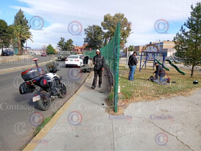 El exceso de velocidad al conducir una motocicleta fue la causa del percance sufrido por un joven que terminó dentro de una unidad deportiva a raíz del incidente, que obligó a su hospitalización.