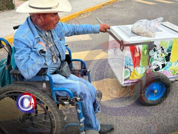 Con un solo brazo funcional, una pierna amputada y desplazándose en una silla de ruedas, un adulto mayor recorre las calles empujando con enorme esfuerzo su carrito de paletas para ganarse la vida de manera honesta.