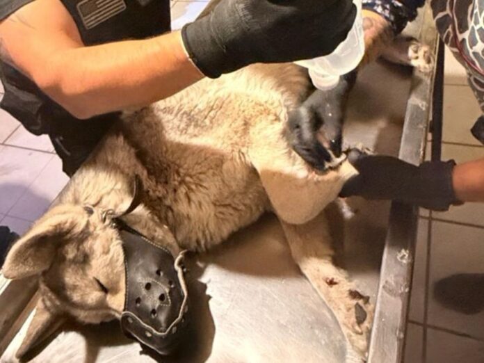 Los agentes le ordenaron detenerse y, al revisar al animalito, descubrieron heridas en sus cuatro patas, aparentemente causadas por las cuerdas con las que había sido amarrado.