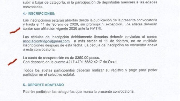 Además, los lineamientos técnicos establecen que la afiliación a federaciones no es obligatoria durante el proceso clasificatorio, por lo que el cobro por este concepto también ha sido cuestionado por deportistas y especialistas en cultura física.