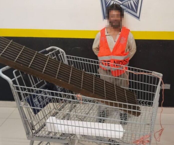 Un sujeto fue detenido luego de un robo cometido en uno de los patios de un centro comercial ubicado en el fraccionamiento El Edén; al individuo se le hizo fácil tomar una rejilla metálica, pero también un carrito del supermercado para llevársela.