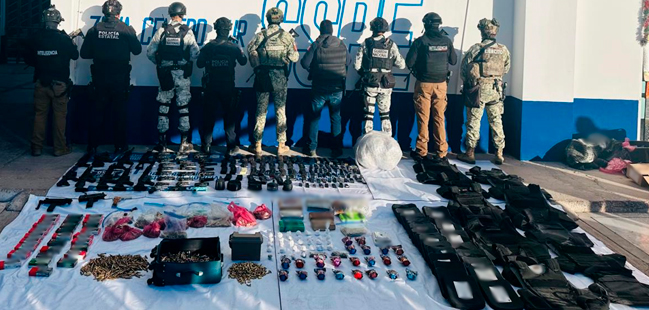 En Chihuahua, específicamente en Aquiles Serdán, las fuerzas de seguridad aseguraron 39 armas de fuego, 102 cargadores, 5,023 cartuchos, así como siete kilogramos de cocaína y nueve de marihuana, además de equipo táctico, una cámara de videovigilancia y un inmueble.